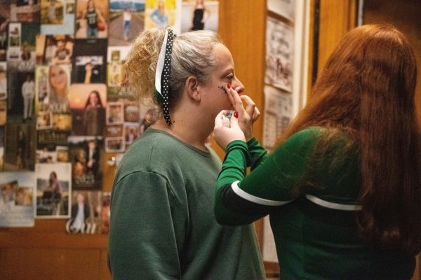 Mrs. Tate getting school spirit makeup by cheerleader Reata. (Sahara Small)